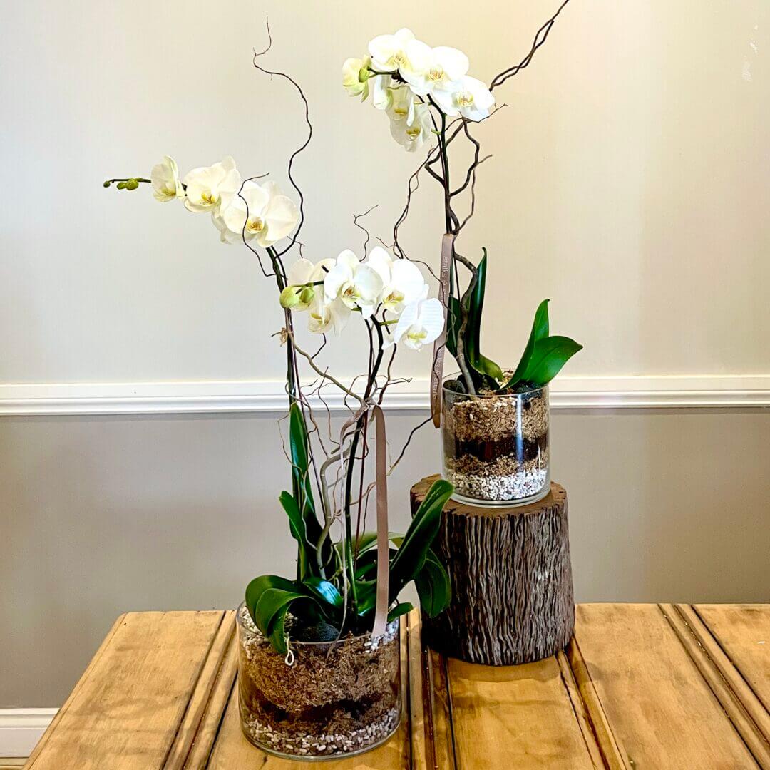 Stunning white orchids expertly planted into a quality glass bowl accented with architectural branches and rustic, botanical accents.