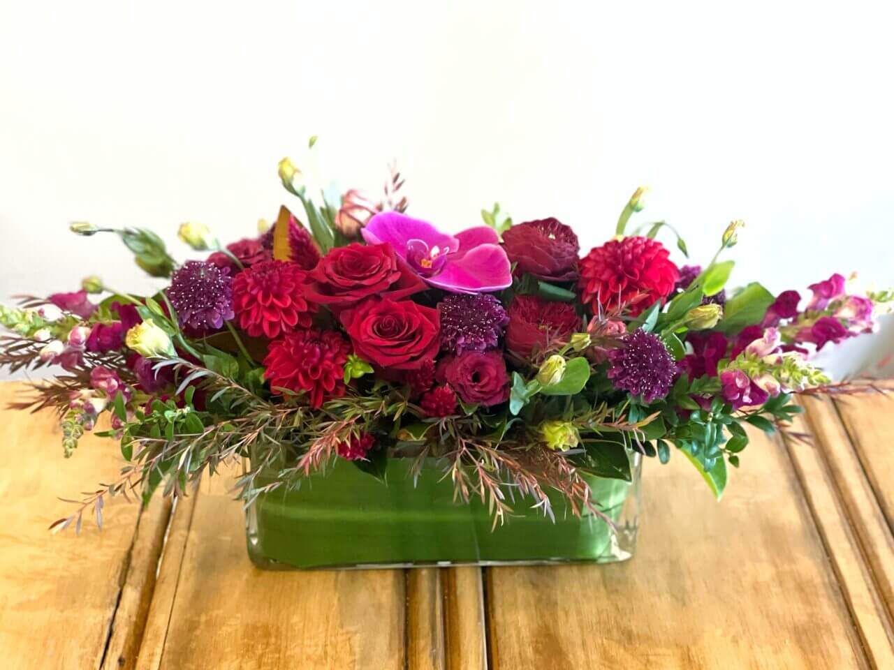 A vibrant arrangement featuring luxurious premium florals. A show stopping combination perfect for any occasion. Expertly arranged in a long and low “hedge” style design, presented in a premium glass vase.