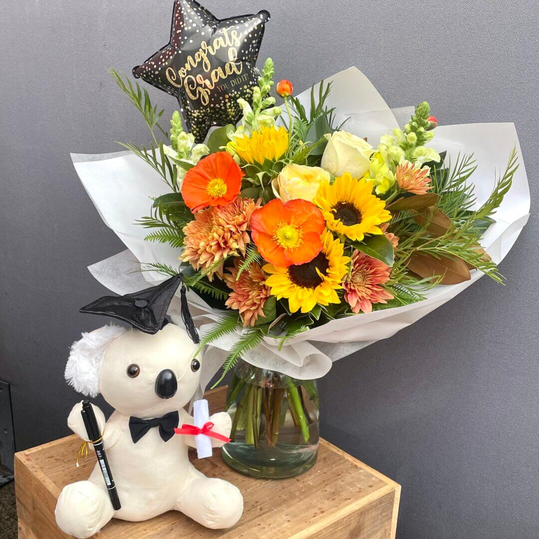 This pack includes a beautiful bouquet of fresh flowers in Bright and sunny colours, a “Congrats Grad” Balloon and a Calico Signing Koala.