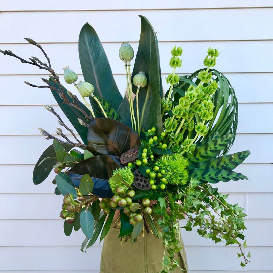 Simple and elegant with a modern edge, Mean Green is a divine combination of the seasons most interesting and textural foliages, pods and berries.