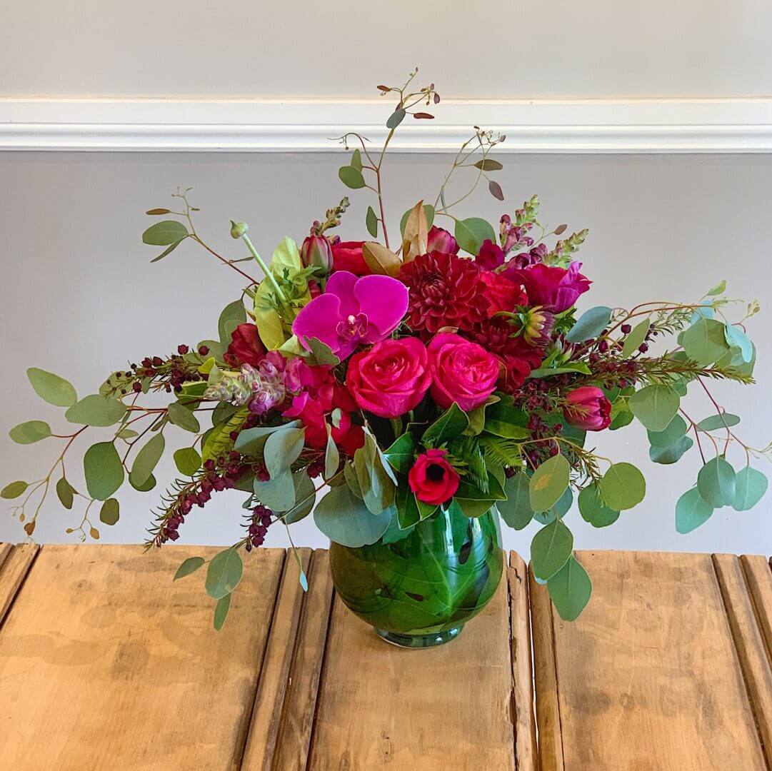 A breathtaking mixed floral bouquet in rich tones of red and burgundy and pink. Designed in a gorgeous bouquet with lush, tropical foliage and completed with our signature botanical elements.